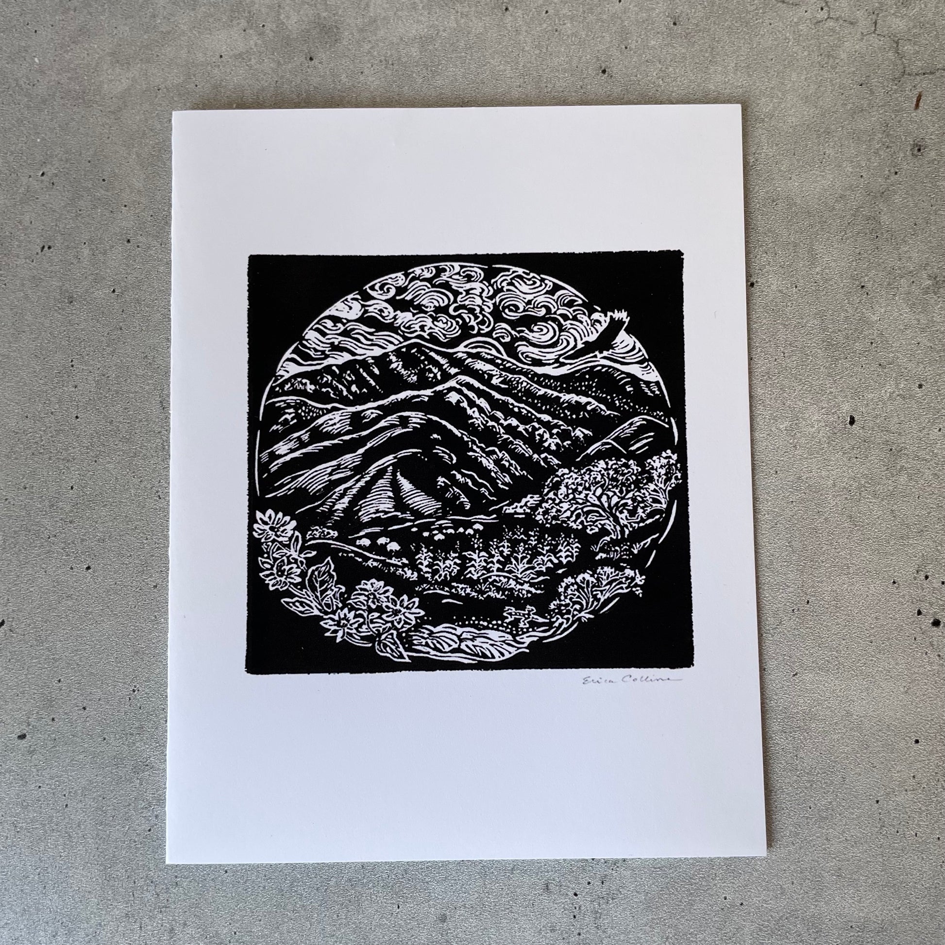 Reproduction of original Wood Block Print by Erica Collins. Art card printed on high quality, heavy card stock, includes envelope. Package of 6.