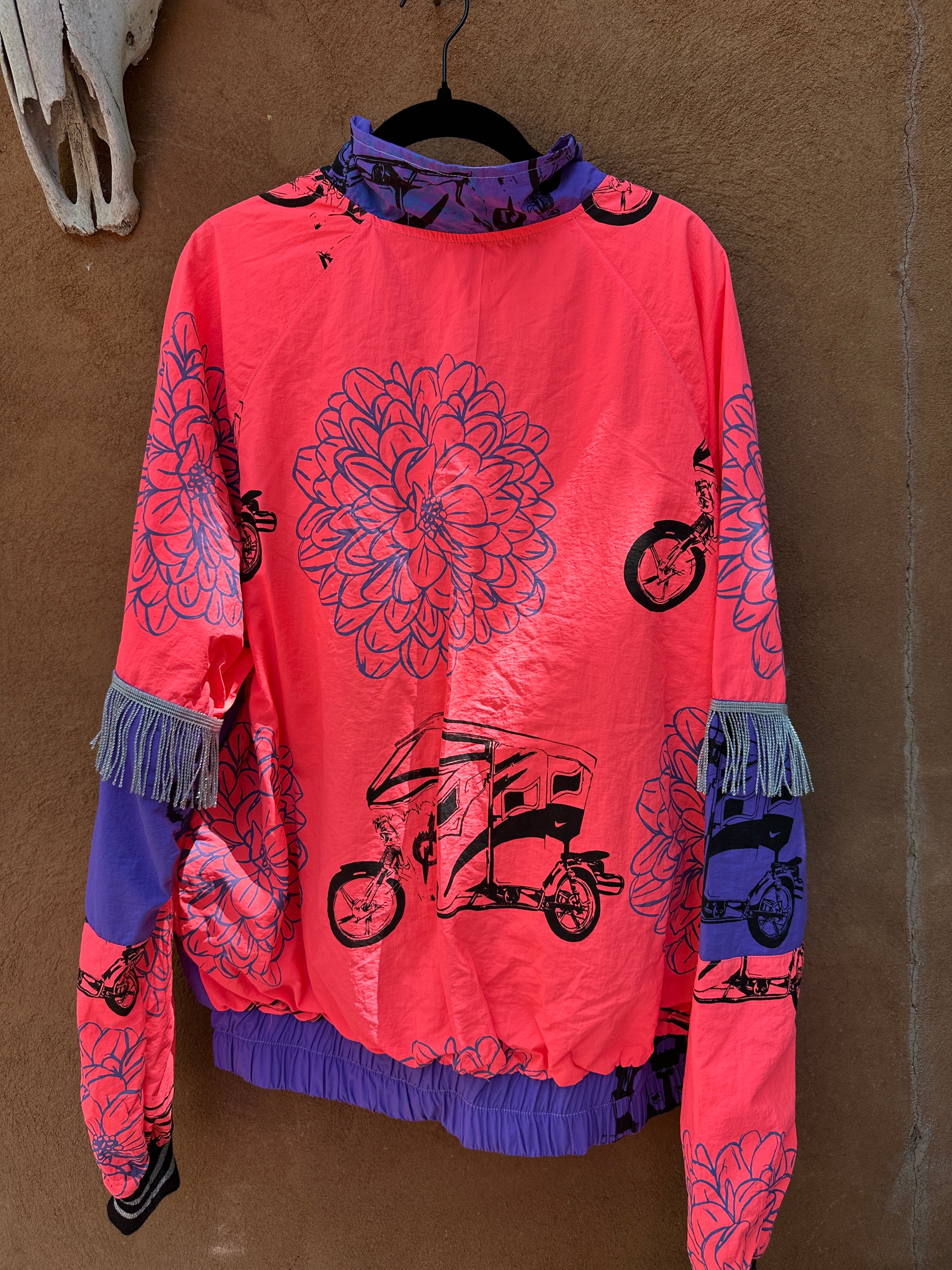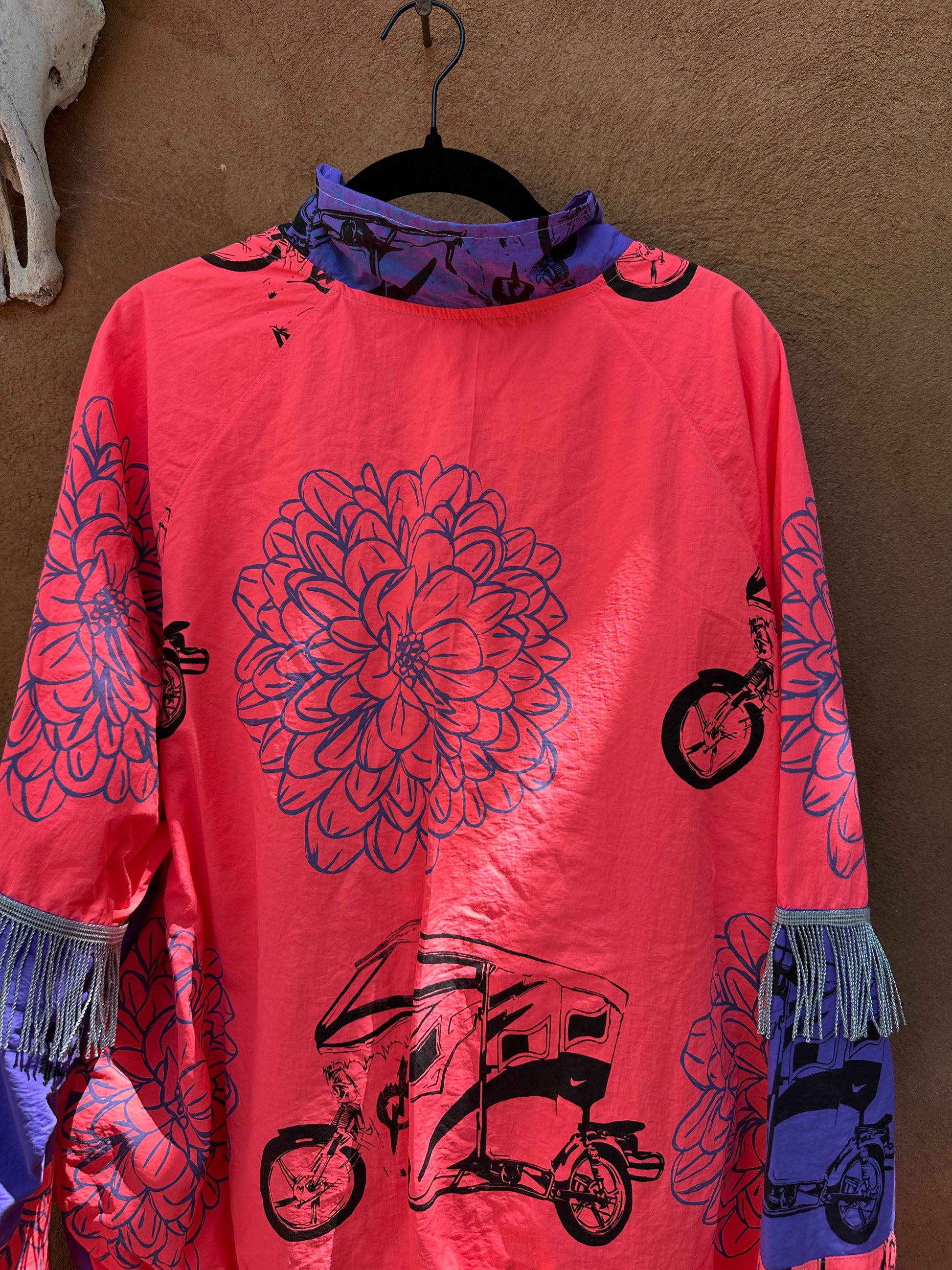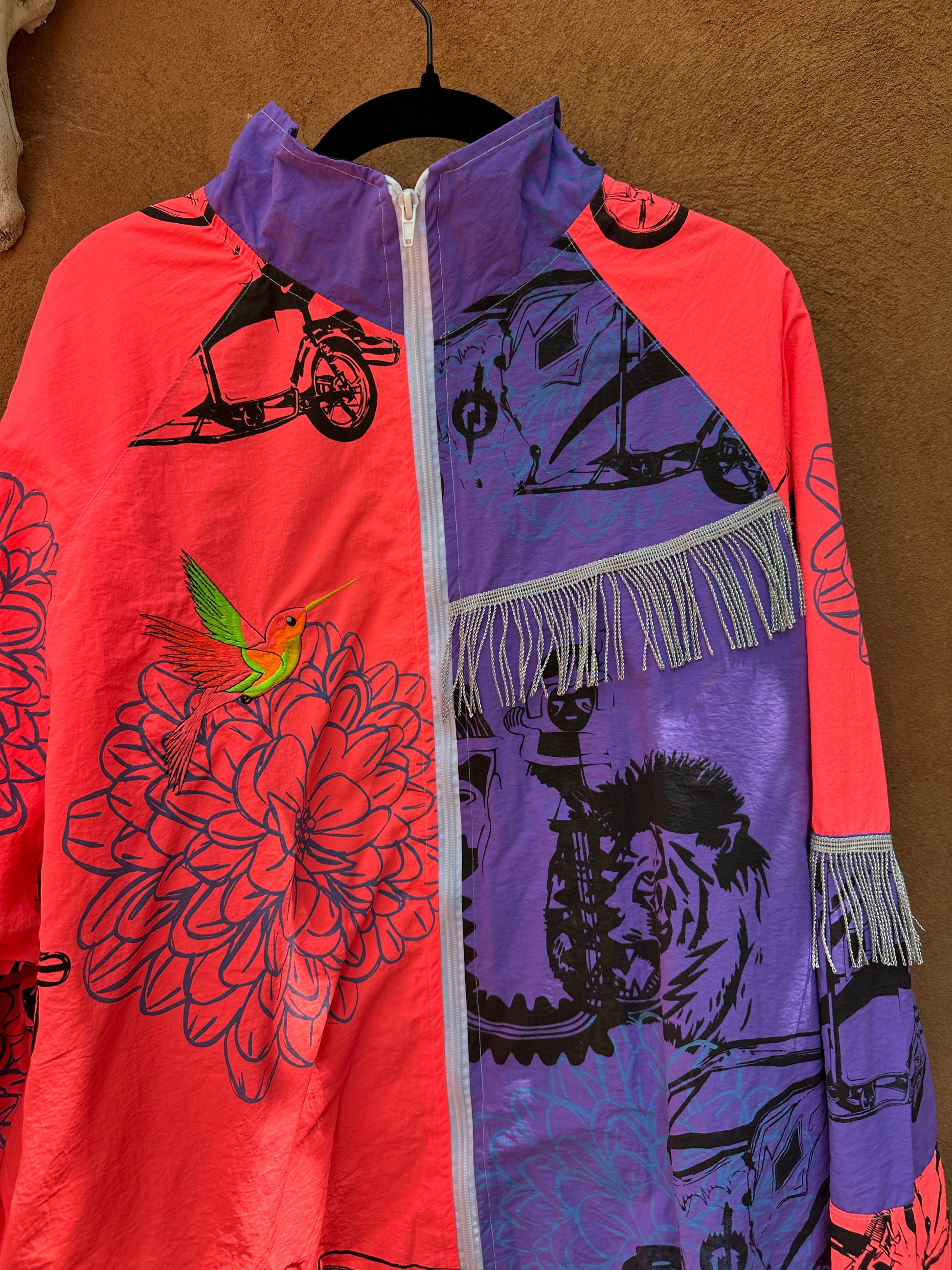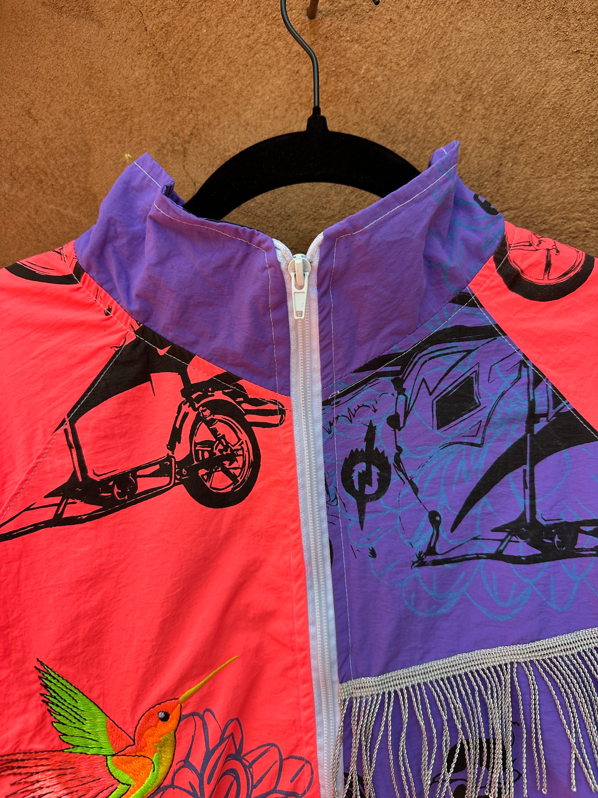This one of a kind jacket is a piece of wearable art made from upcycled dead stock and vintage fabrics. It is screen printed by hand with Amapolay's unique graphic design, inspired by ancient Peruvian symbology and Limeño street art. It also includes embroidered elements that evoke the colorful style of the traditional "pollera," the highly decorated skirts worn by Andean women. This piece is made with care and attention to detail in every step of the process. Amapolay designs, prints, and sews each jacket by hand.