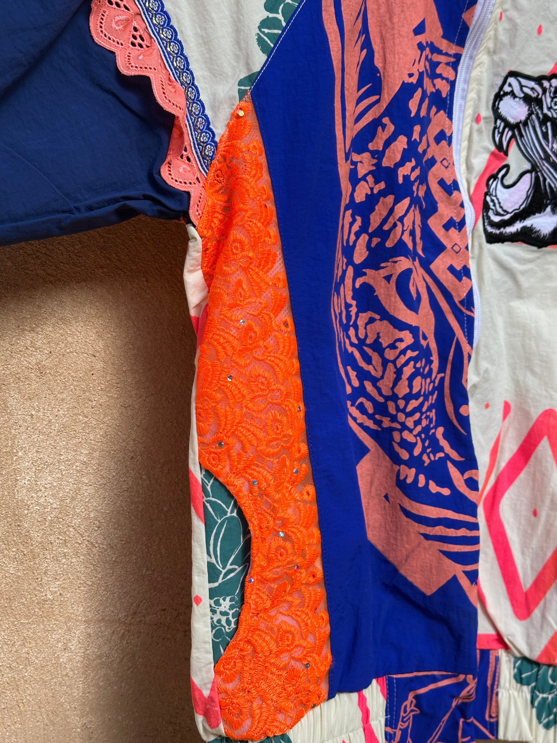 This one of a kind jacket is a piece of wearable art made from dead stock and vintage fabrics. It is screen printed by hand with Amapolay's unique graphic design, inspired by ancient Peruvian symbology and Limeño street art. It also includes embroidered elements that evoke the colorful style of the traditional "pollera," the highly decorated skirts worn by Andean women. This piece is made with care and attention to detail in every step of the process. Amapolay designs, prints, and sews each jacket by hand.