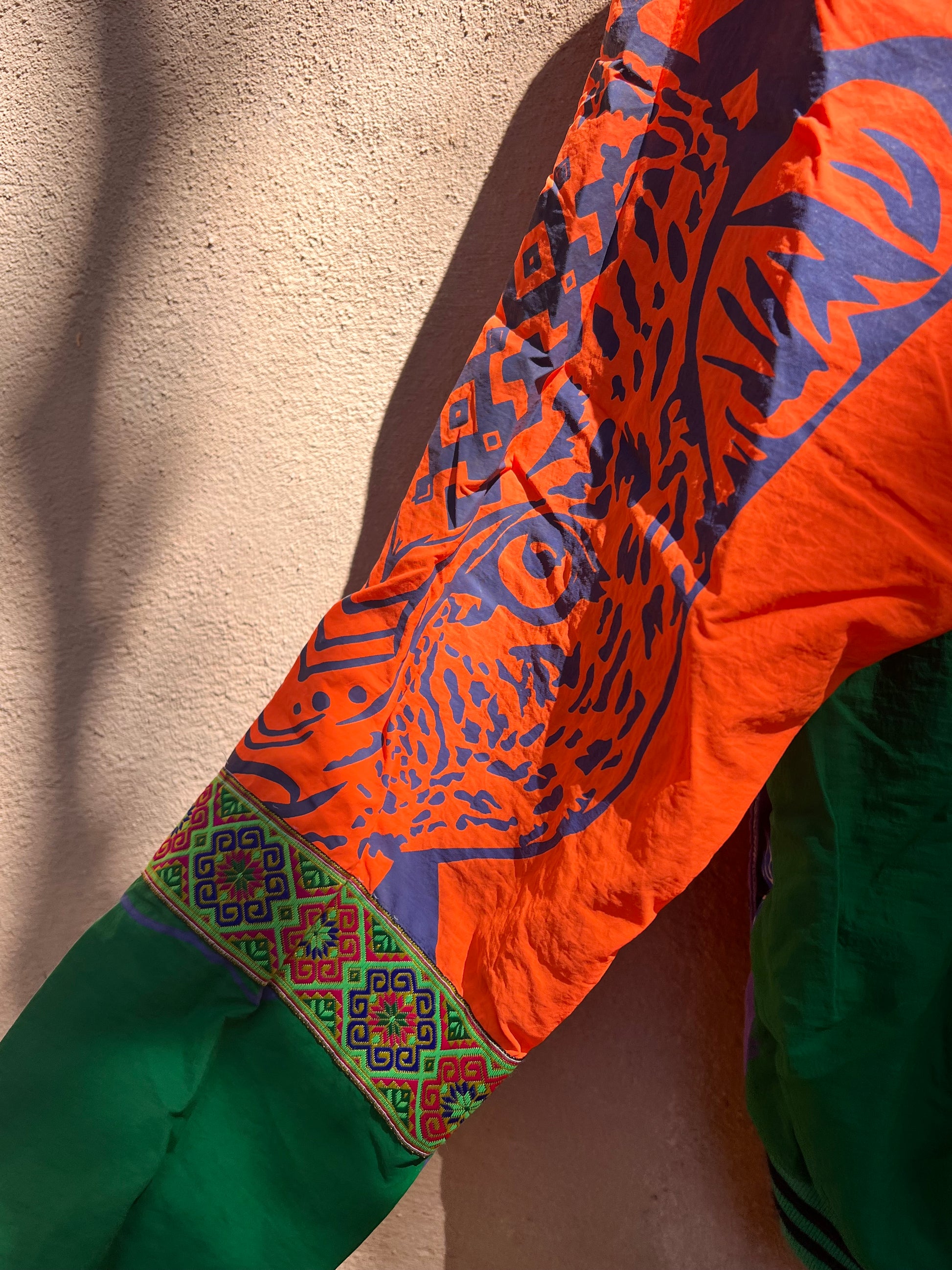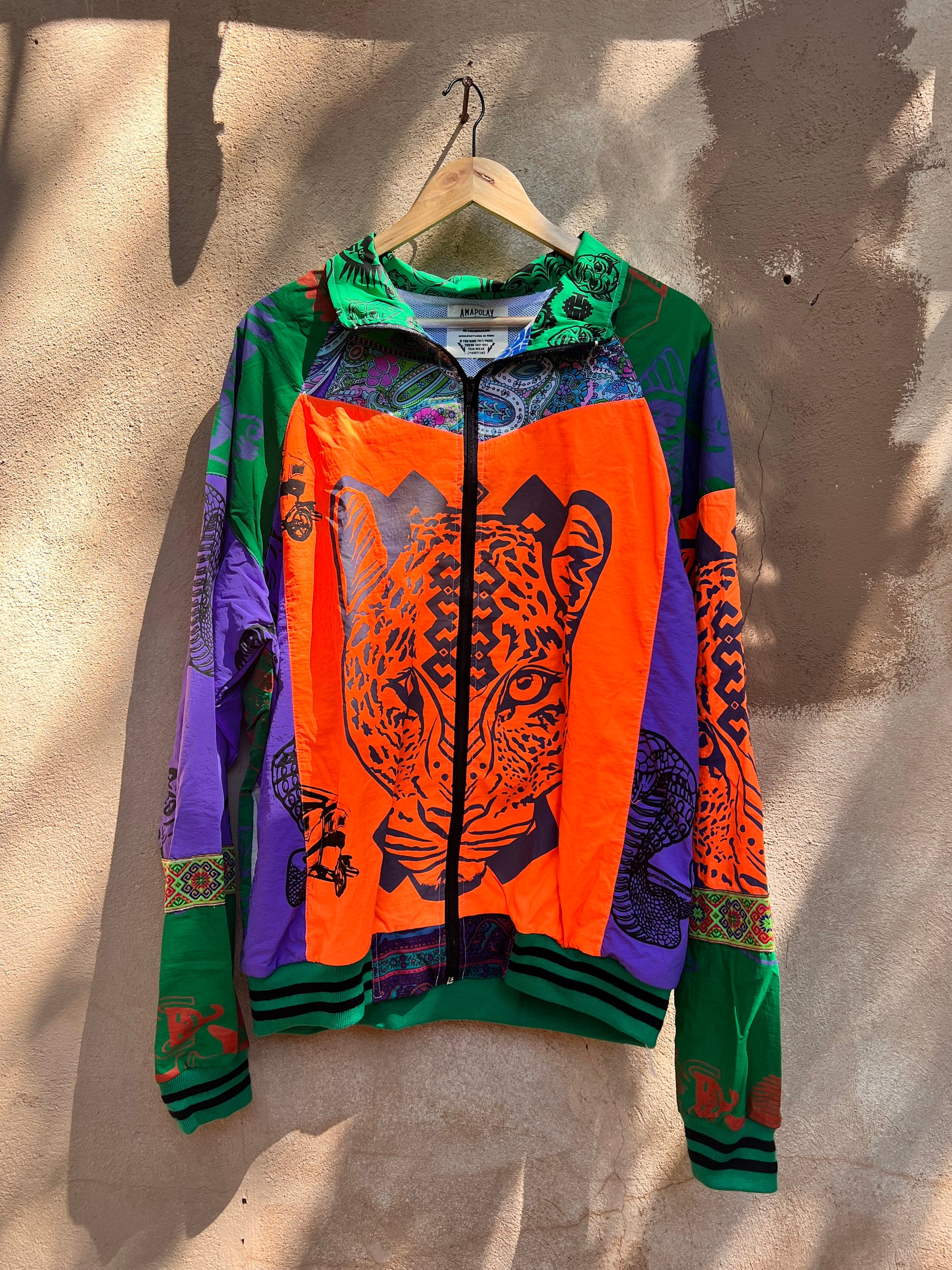 This one of a kind jacket is a piece of wearable art made from upcycled dead stock and vintage fabrics. It is screen printed by hand with Amapolay's unique graphic design, inspired by ancient Peruvian symbology and Limeño street art. It also includes embroidered elements that evoke the colorful style of the traditional "pollera," the highly decorated skirts worn by Andean women. This piece is made with care and attention to detail in every step of the process. Amapolay designs, prints, and sews each jacket by hand.