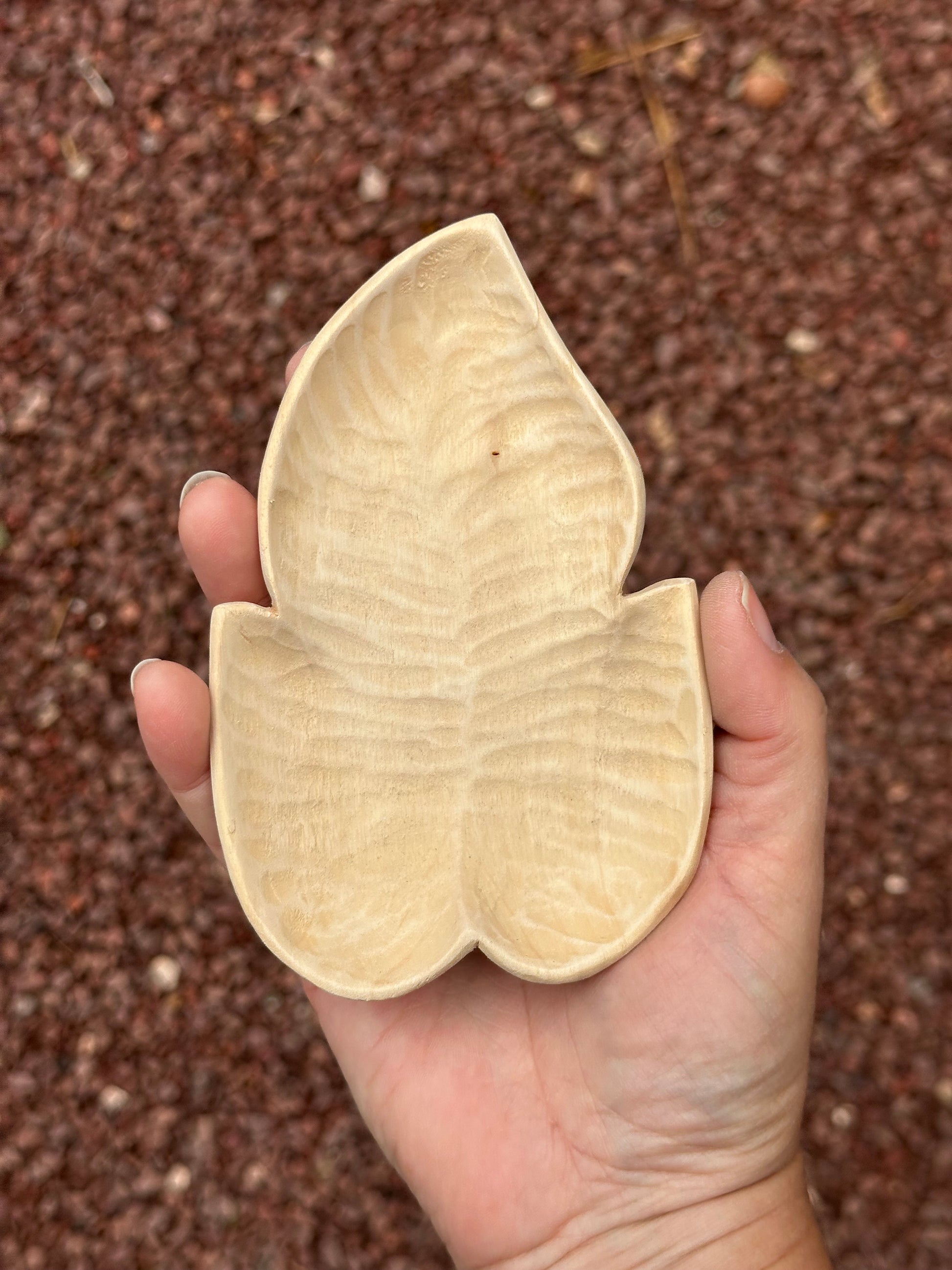 This tray has a beautiful leaf design and measures approximately 5” by 3”