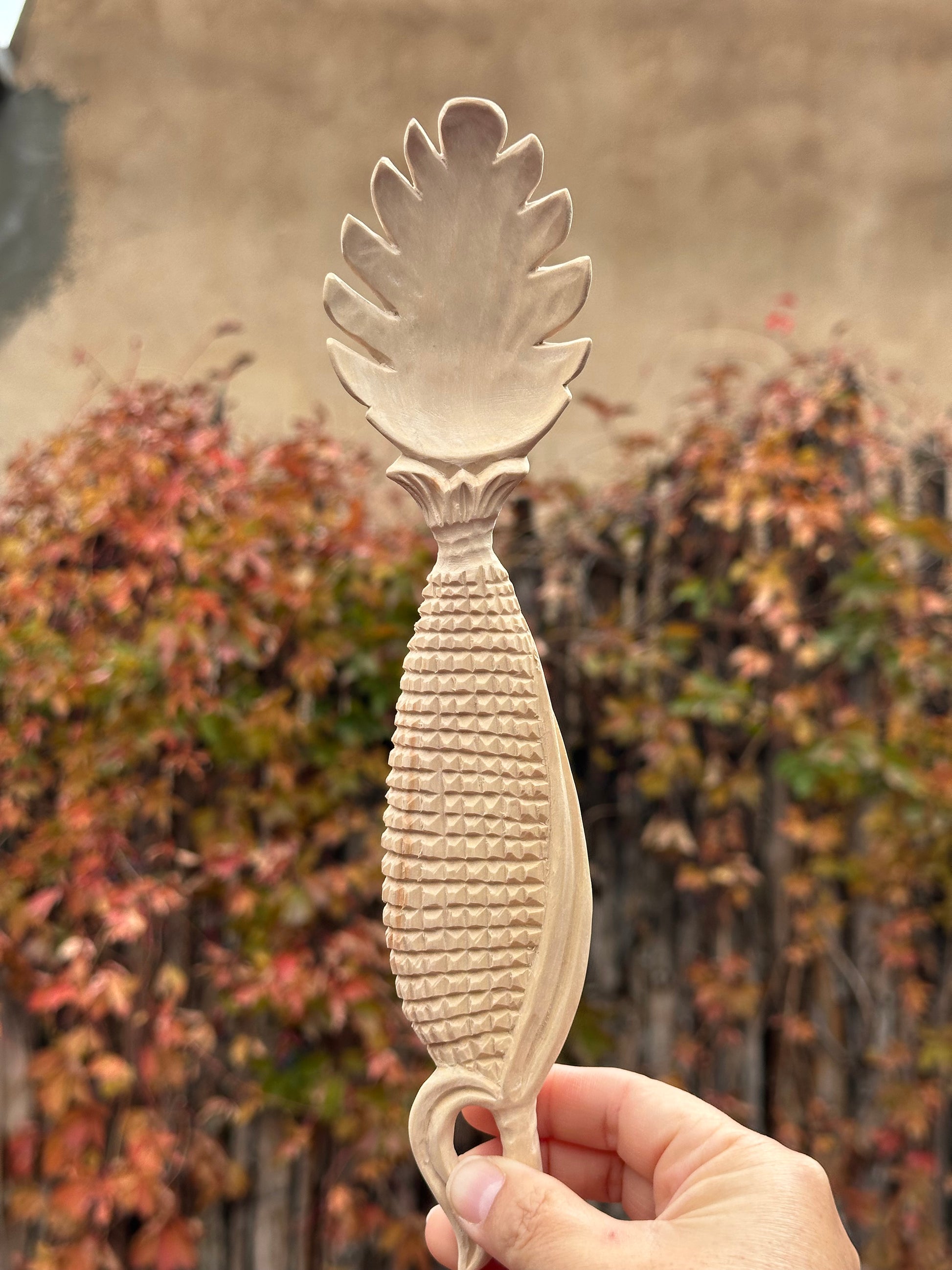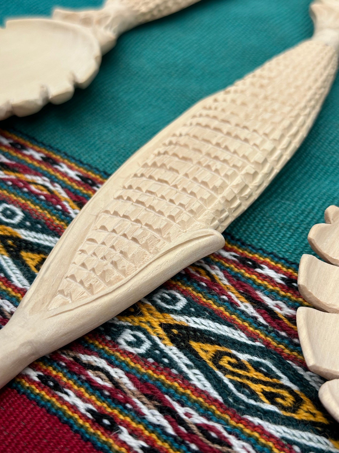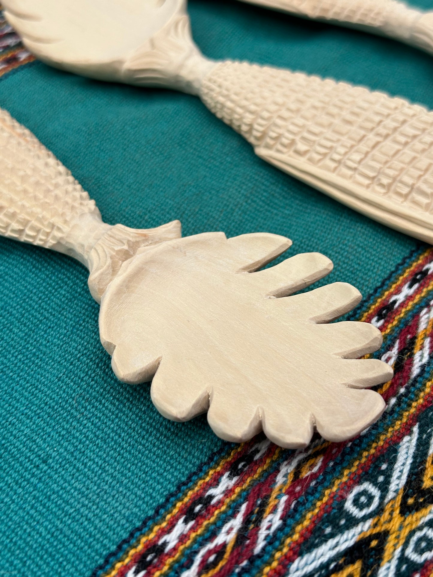 This spoon is made by a family of master wood carvers in Ayacucho, Peru. They harvest and use "unka", a shrub-like tree endemic to the Andes that is highly prized for its hard, almost white wood that has no taste or smell. The Ciprian family is well-known for their highly detailed carvings and finely designed utensils that are made by hand.